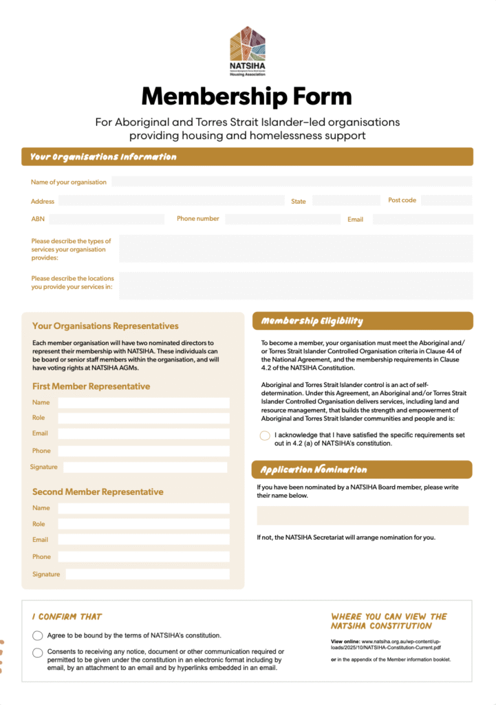 Membership is about building strength together. By joining NATSIHA, your organisation stands alongside other Aboriginal and Torres Strait Islander Controlled housing Organisations from across the country to create a strong national voice for housing.